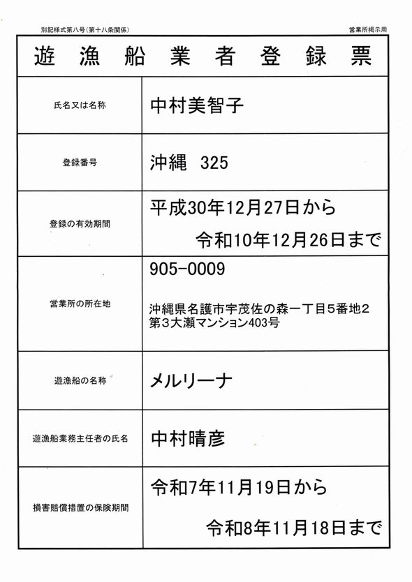 遊 漁 船 業 者 登 録 票
